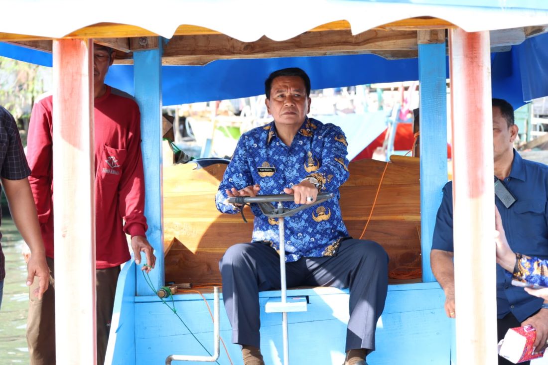 Setelah penyerahan bantuan, Bupati Maesyal juga berkesempatan menaiki kapal dan menahkodai langsung kapal yang diserahkan.
