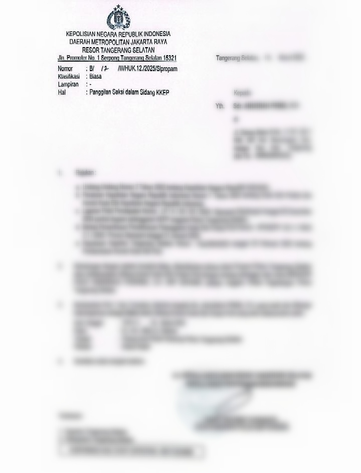 Anugerah Prima, SH membenarkan adanya panggilan sebagai saksi pada Sidang Komisi Kode Etik Profesi Polri terhadap Brigadir Fhilip Hendrikus Pasaribu yang akan dilaksanakan di Ruang Aula Polsek Serpong Polres Tangerang Selatan.