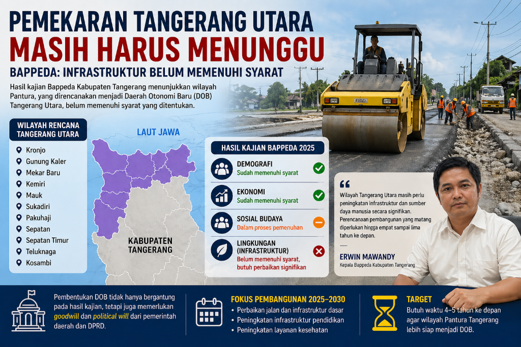 TANGERANG, (JT) – Rencana pemekaran wilayah Tangerang Utara menjadi Daerah Otonomi Baru (DOB) tampaknya masih membutuhkan waktu panjang. Berdasarkan hasil kajian Badan Perencanaan Pembangunan Daerah (Bappeda) Kabupaten Tangerang, kawasan Pantai Utara (Pantura) dinilai belum sepenuhnya memenuhi syarat untuk dimekarkan menjadi wilayah administrasi baru.